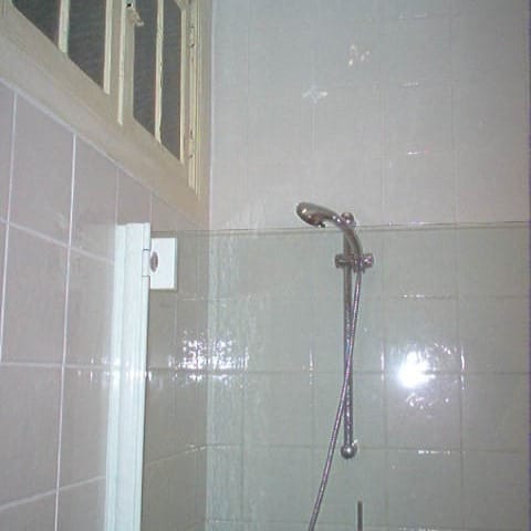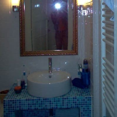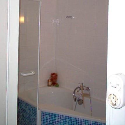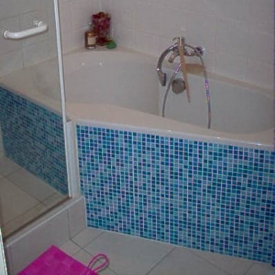 1 van onze eerste badkamer die wij 25 jaar geleden geplaatst hebben in een jaren 30 woning in de wijk Wipstrik in Zwolle. Er is hier een badkamer gemaakt op 4 vierkante meter waar optimaal gebruikt is gemaakt van de ruimte. Het bad komt hier met zijn schuine vorm uitstekend tot zijn recht. De ene kant sluit naadloos aan op het zelfgemaakte wasmeubel die vervolgens is betegeld met mozaïk tegels. De andere kant van het bad sluit aan op de douche. op de wand van het bad staat een badwand die aansluit op de douchedeur.